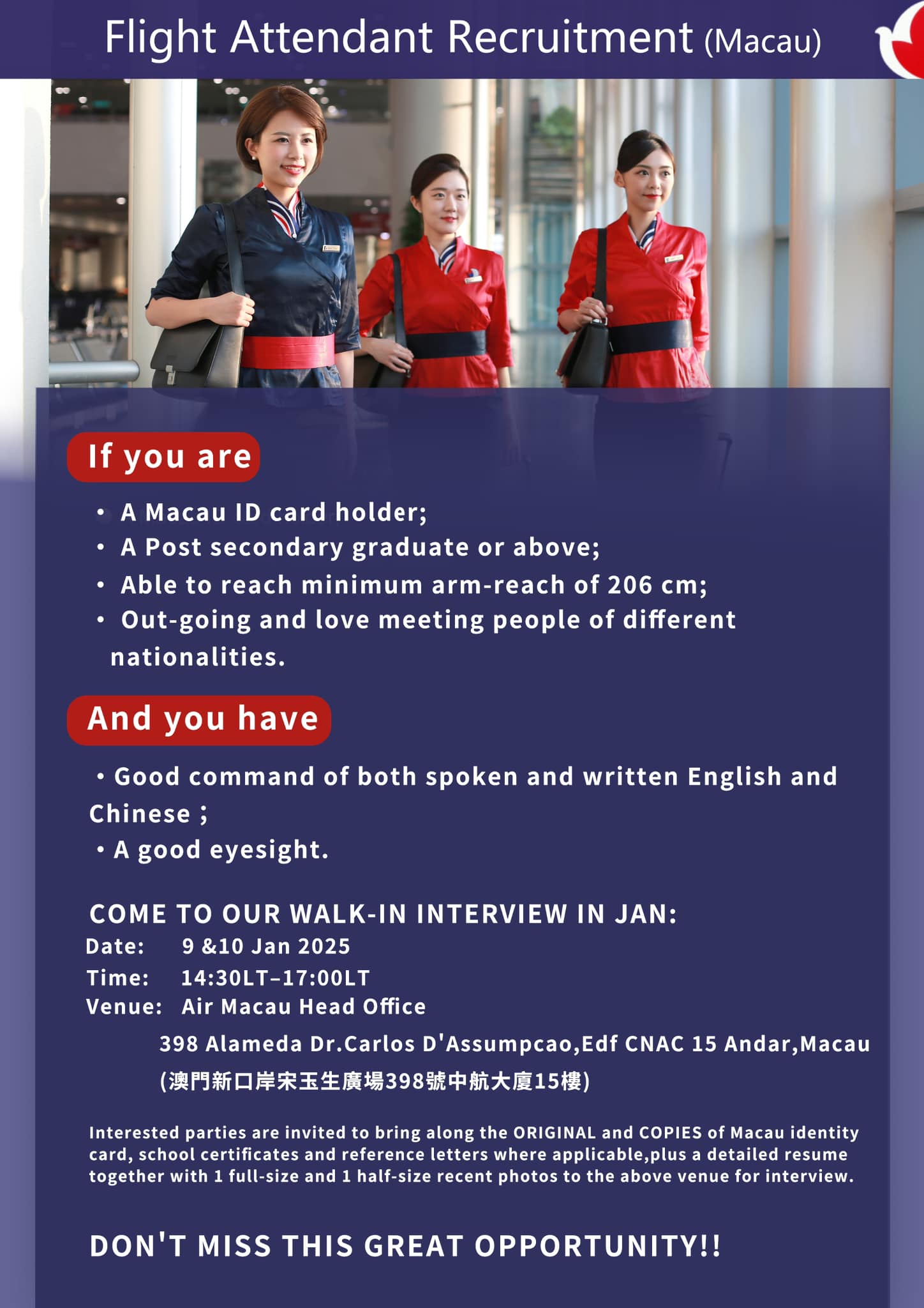 Air Macau Flight Attendant Walk-In Interview [Macau] (9 – 10 January 2025)