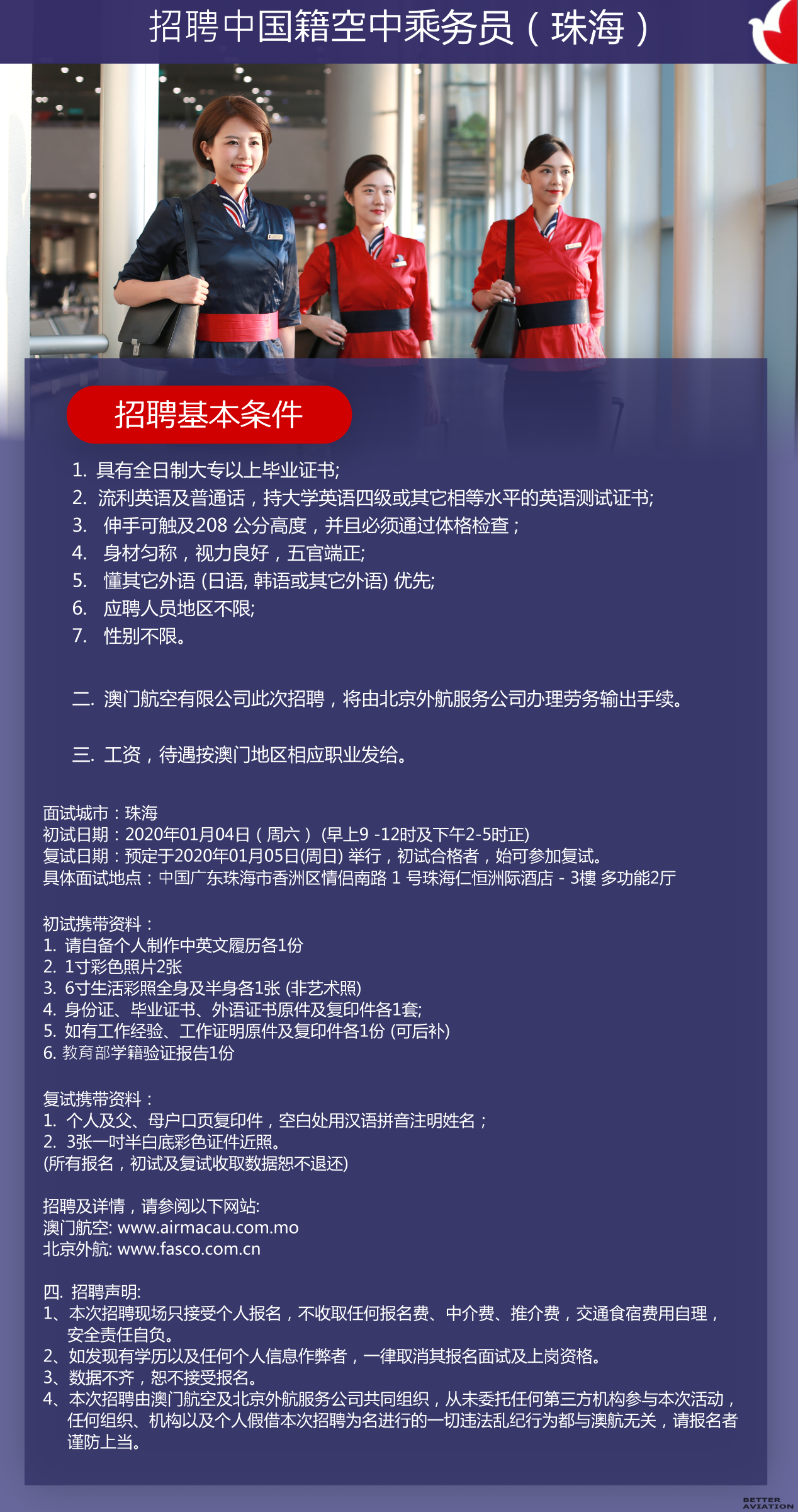 4. 本次招聘由澳门航空及北京外航服务公司共同组织,从未委托任何第三方机构参与本次活动,任何组织、机构以及个人假借本次招聘为名进行的一切违法乱纪行为都与澳航无关,请报名者谨防上当。