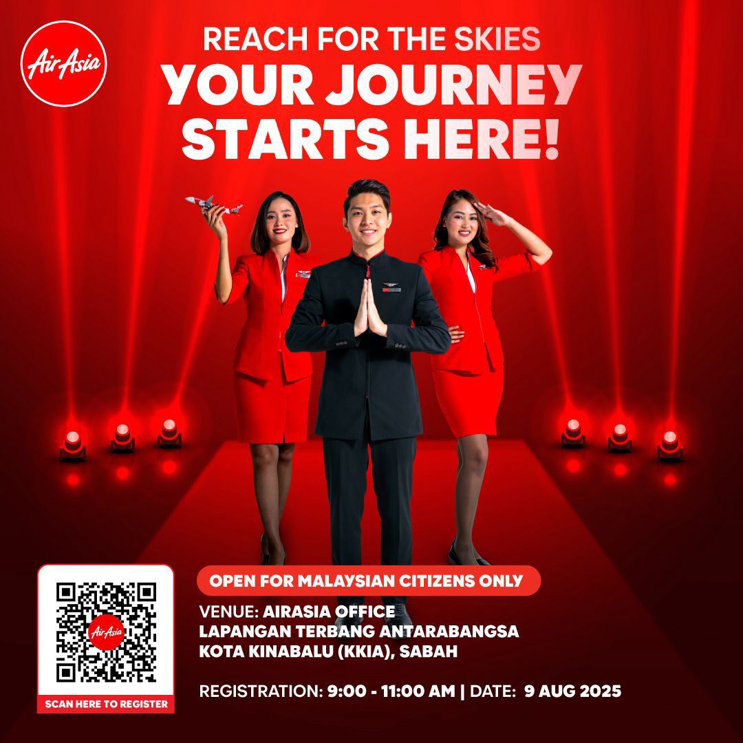 Join us for an AirAsia Cabin Crew Interview on 9th August 2025, AirAsia Office, Kota Kinabalu International Airport (KKIA), (Registration 9am to 11am).