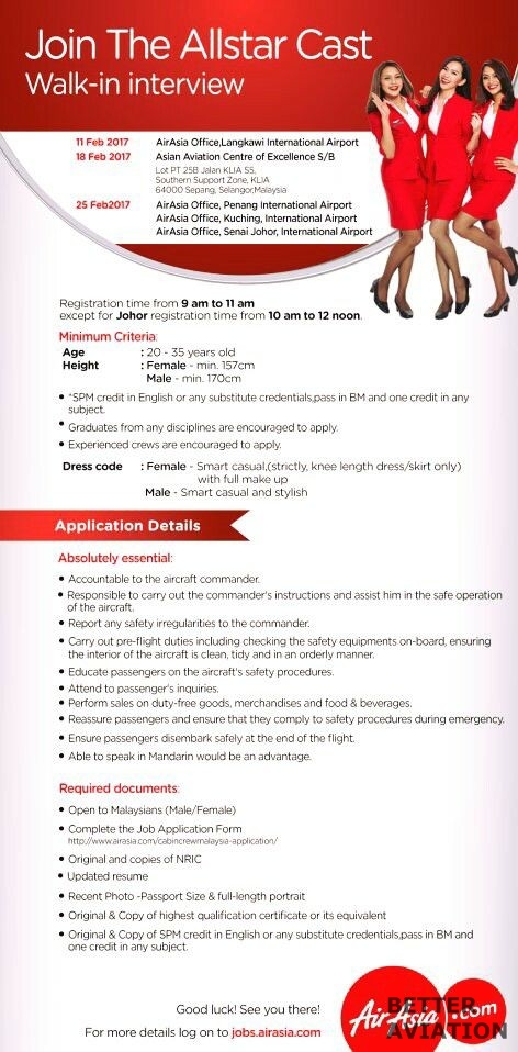 - Complete the Application Form (http://www.airasia.com/cabincrewmalaysia-application/)
