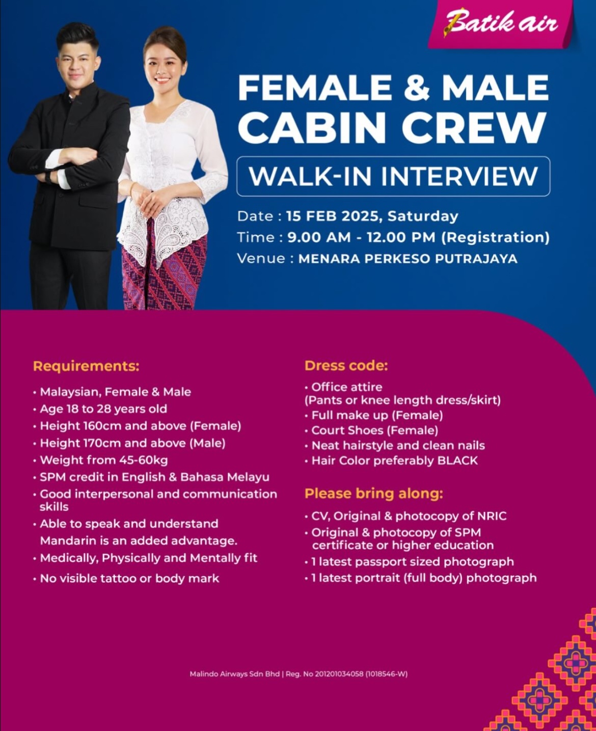 Batik Air Malaysia Cabin Crew Walk-In Interview [Putrajaya] (15 February 2025)