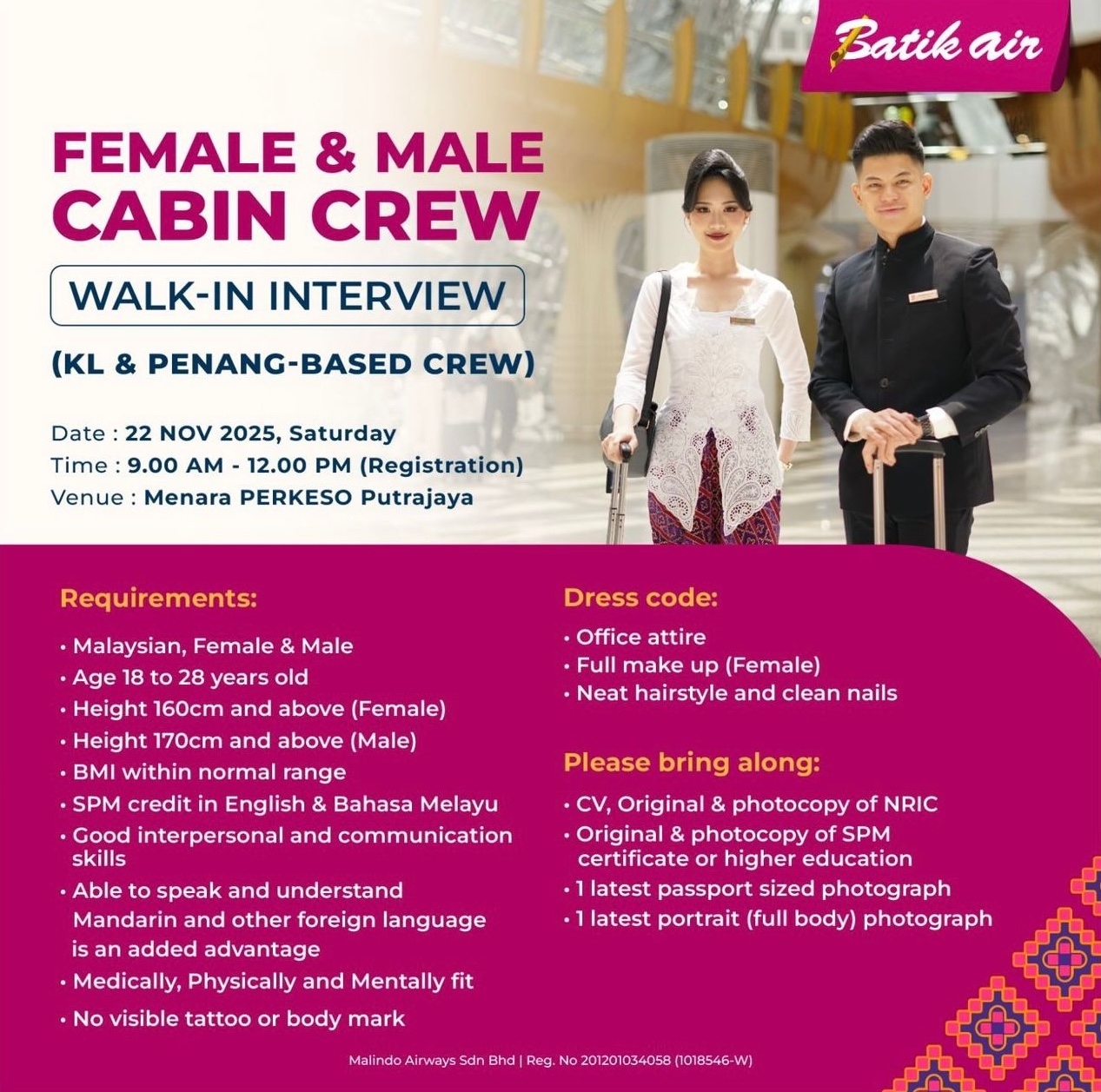 Batik Air Malaysia Cabin Crew Walk-In Interview [Putrajaya] (22 November 2025)