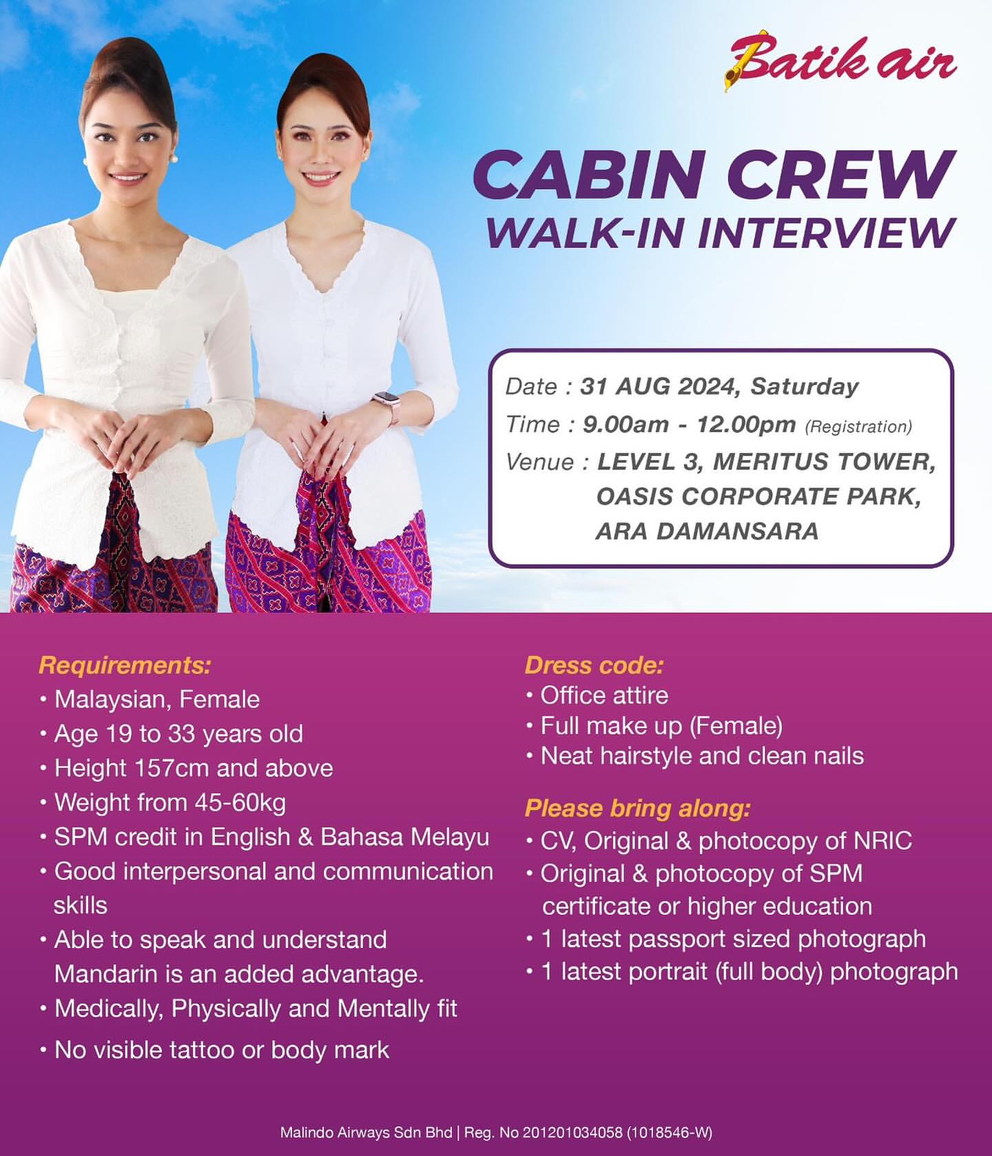 Batik Air Malaysia Cabin Crew Walk-In Interview [Selangor] (31 August 2024)