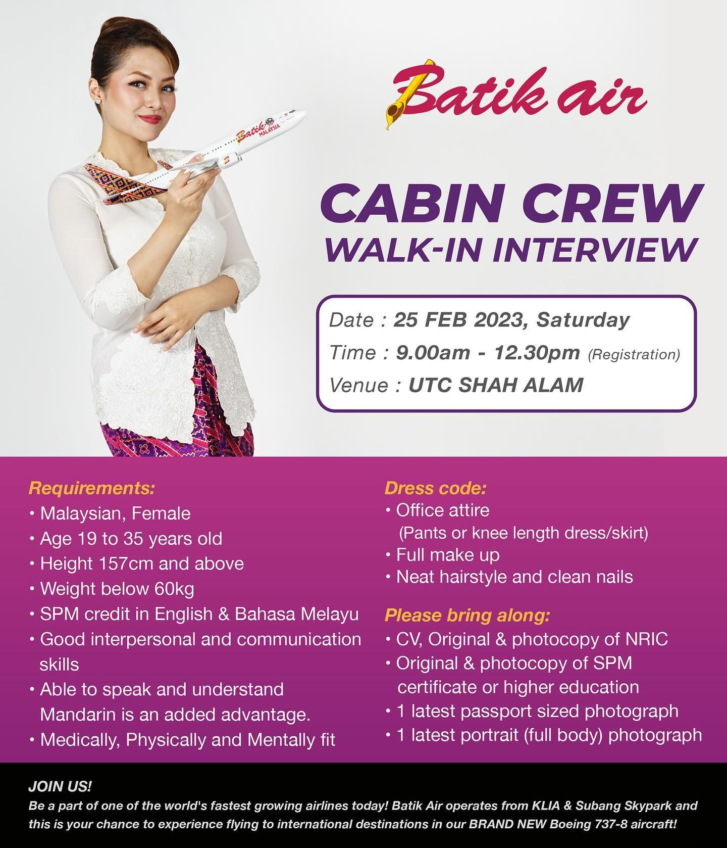 Batik Air operates from KLIA & Subang Skypark and this is your chance to experience flying to International destinations in our BRAND NEW Boeing 737-8 aircraft!