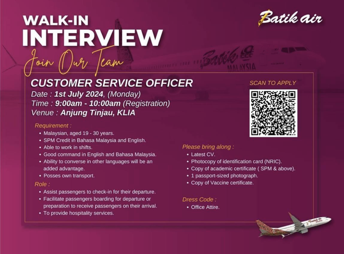 Batik Air Malaysia Customer Service Officer [KLIA] (01 July 2024)