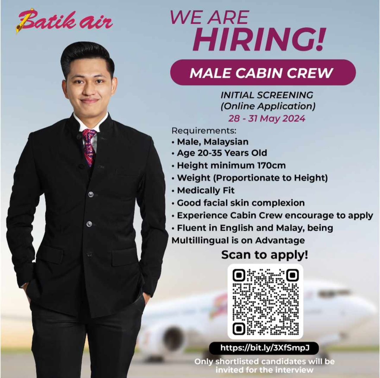 Batik Air Malaysia is hiring Male Cabin Crew.